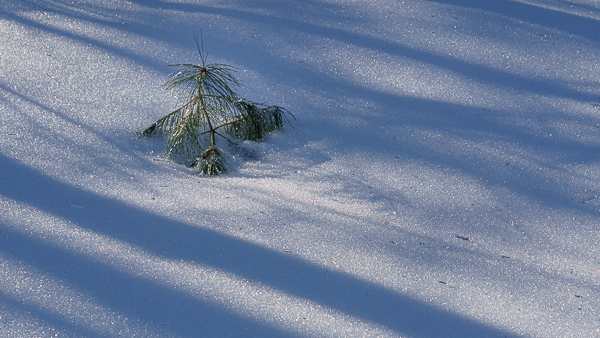 A young pine casts a shadow on the snow. Spring officially starts this month in Maine! At least that’s what the calendar says.