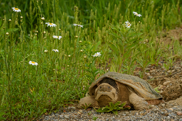 I recently spent a few days at Moosehorn National Wildlife Refuge, where I watched these female snapping turtles laying their eggs in holes that they dig in sandy spots away from the water. I lied on my stomach to get an eye-to-eye perspective.