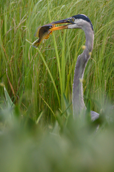A great blue heron wrestles with lunch in Great Meadow Stream between North and Great Ponds in Maine’s Belgrade Lakes region.